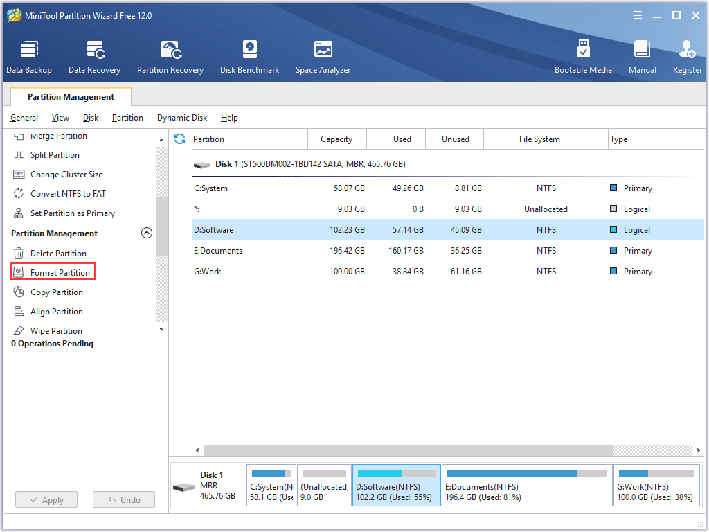 MiniTool Partition Wizard is an alternative formatting tool that can help you clear partition data and then reconfigure parameters for the specified partition in Windows Vista.